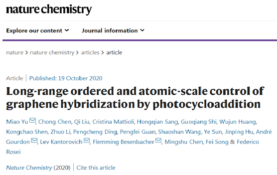 哈工大报讯(化工/文) 近日,我院于淼教授课题组在石墨烯功能化方面取得了重要进展。该工作为石墨烯光致精准功能化的首例,通过精细调控局域杂化模式打开石墨烯带隙,首次在原子尺度实现了石墨烯的二维长程有序功能化,为石墨烯基二维材料在电子器件和光电器件应用方面的关键难题提供了有效解决方法。相关研究成果以“通过光致环加成反应长程有序原子级调控石墨烯杂化(Long-range ordered and atomic-scale control of graphene hybridization by photocycloaddition)”为题,于2020年10月19日在线发表于国际知名学术刊物《自然•化学》(Nature Chemistry)。于淼教授为论文第一作者(通讯作者),太阳成tyc234cc为第一单位,我校化工与化学学科首席学术顾问、哈尔滨-奥胡斯多尺度表界面国际研究中心(HAISI)荣誉主任弗莱明•贝森巴赫院士为共同通讯作者。
