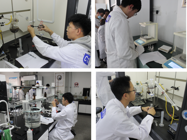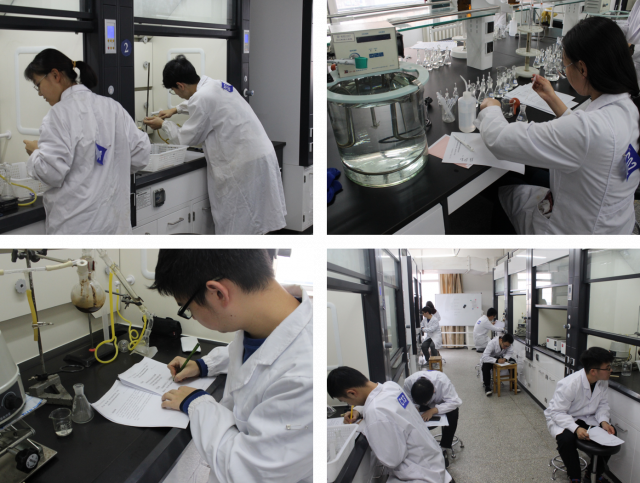 经过初赛笔试,成绩位列前25名的小组成功晋级决赛。决赛实验竞赛部分分为有机化学、物理化学、无机化学和分析化学3个实验方向,每名参赛选手需单独完成不同类型的实验内容。决赛场上,参赛选手根据各自实验试题要求完成实验内容,并根据各自实验结果完成实验报告。比赛过程中,选手们认真思考、规范操作,时刻保持一丝不苟、认真严谨的态度,历经四个半小时在规定的实验时间要求下,完成了各自的决赛实验内容。