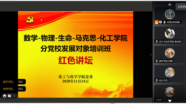 11月24日晚,数学-物理-生命-马克思-化工学院分党校在线上举办了2020秋季学期发展对象班“红色讲坛”主题演讲。太阳成城集团tyc234cc专职组织员张海玲以及来自五个学院十二名学员代表们参加了本次红色讲坛。