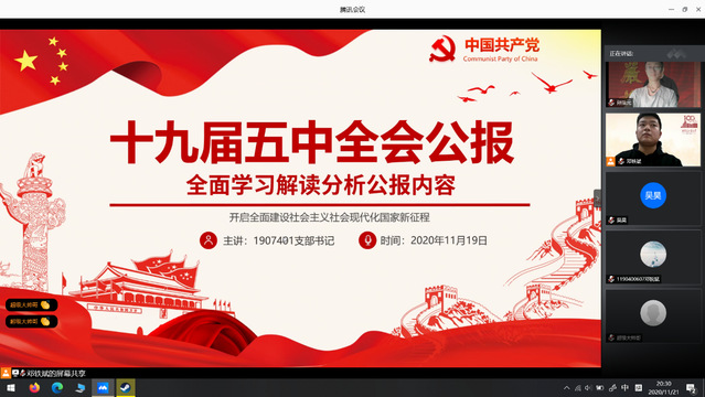 邓轶斌带领班级同学共同学习十九届五中全会公报内容,领悟开启全面建设社会主义现代化国家新征程的重大意义,了解公报中提到的2035年要实现的九方面远景目标。同时,同学们结合个人实际情况,针对青年如何立足自身,为建设社会主义现代化国家新征程做出贡献进行了充分交流,大家一致认为党的十九届五中全会擘画了全面建设社会主义国家的新蓝图,为今后一段时期发展指明了方向、提供了遵循。