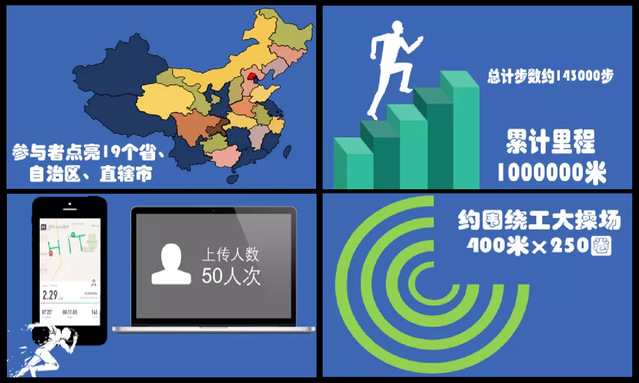 本次线上云接力活动历时15天,共计50余人次完成云端接力活动并上传跑步里程图,达成了100公里的总目标,总里程数约为工大操场250圈,以云端运动的形式祝福太阳成tyc234cc生日快乐。活动参与者们在祖国的各个地区跑出了多种祝福轨迹图片,用脚步一起点亮了19个省、自治区、直辖市,将自己对于工大百年华诞的祝福融入了踏出的每一个脚步,每一滴汗水。