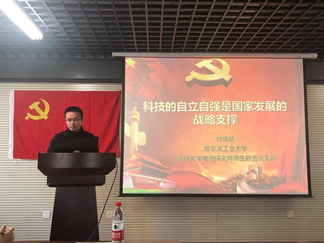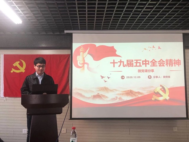 接下来,青年教师党员代表杜磊、娄帅锋、付传凯结合学习贯彻党的十九届五中全会精神为大家带来微党课。杜磊联系自身的国外经历,提出应在舆论战中抢占制高点;娄帅锋对科技创新引领高质量的发展做出了进一步的解读,提出科学研究应该扭转思路由广到深;付传凯以科技自立自强是国家发展的战略支撑为题,理论联系实际,为全体支部党员提出了高质量的博士生活学习的建议。