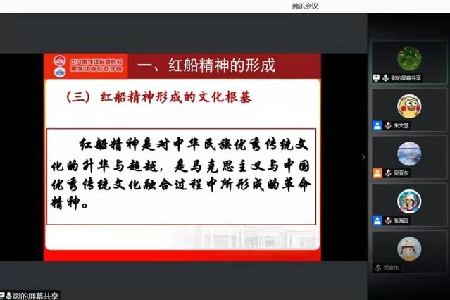 兰丽影从三个部分展开了讲述,第一部分是红船精神的形成。近代中国饱受列强的侵略,国弱民穷,无数仁人志士站了出来,寻求救亡图存的道路,农民阶级、地主阶级、资产阶级的努力却都以失败告终。在这样的历史背景下,早期中国共产党人承担起了民族重任,红船精神逐渐形成,它以马克思主义理论来源、中国优秀传统文化为根基、以广大工人阶级为基础。第二部分是红船精神的内涵,是开天辟地,敢为人先的首创精神;是坚定理想,百折不挠的奋斗精神;是立党为公,忠诚为民的奉献精神。第三部分是红船精神的弘扬。兰丽影强调,弘扬红船精神,必须要深刻认识红船精神的时代价值,传承践行首创精神,勇立时代潮头;传承践行奋斗精神,矢志闯关夺隘;传承践行奉献精神,践行根本宗旨,在新时代下,继续努力践行并发扬红船精神。