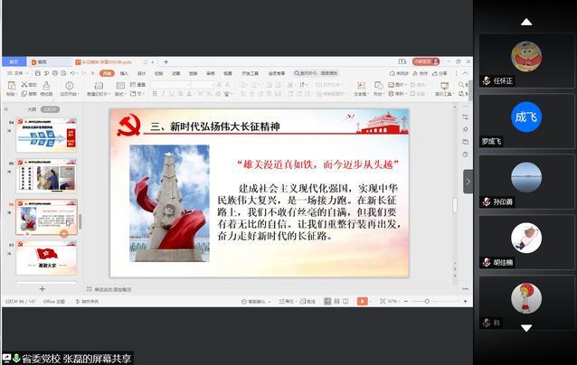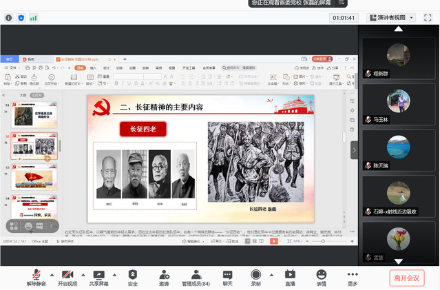 张磊从三个方面展开了讲述,第一部分是长征的艰辛历程。当时国内政治形势发生变化、党内存在“左”倾错误路线,1934年10月,第五次反“围剿”失败,红军被迫进行战略转移,进行长征。长征是人类历史上的伟大奇迹,中央红军行军368天,征服名山险峰40余座,跨越江河近百条,行军途中战斗600余次,打大决战15整天,平均遭遇战每天一次,行程约二万五千里。1936年10月,红军三大主力会师,万里长征胜利结束。第二部分是长征精神的内涵,张磊通过长征途中一个个感人事迹向大家生动阐述了长征精神:是把全国人民和中华民族的根本利益看得高于一切,坚定革命的理想和信念,坚信正义事业必然胜利的精神;是为了救国救民,不怕任何艰难险阻,不惜付出一切牺牲的精神;是坚持独立自主、实事求是,一切从实际出发的精神;是顾全大局、严守纪律、紧密团结的精神;是紧紧依靠人民群众,同人民群众生死相依、患难与共、艰苦奋斗的精神。第三部分是新时代如何弘扬长征精神。张磊讲到,新时代我们要继续坚持党的领导,坚定政治方向;坚定理想信念,淬炼政治忠诚;坚持人民至上,践行群众路线;坚持实事求是,勇闯发展新路,更好的继承弘扬长征精神。