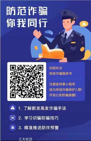 7. 注意财产安全。警惕网络诈骗、信贷陷阱等事件,建议学生扫描下方二维码注册防诈骗小程序“金钟罩”。