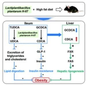 产生胆盐水解酶(BSH)的细菌与宿主体重增加和能量储存负相关,因此研究人员想获得一种具有优异抗肥胖作用的的新型产BSH菌株。在本研究中,研究人员从12种乳杆菌中筛选出一种名叫Lactiplantibacillus plantarum H-87 (H-87)的菌株,这种菌株在体外具有优异的水解甘氨鹅脱氧胆酸(GCDCA)和牛磺熊去氧胆酸(TUDCA)的能力。研究人员同时评估了其在高脂饮食(HFD)C57BL/6J小鼠中的抗肥胖作用。