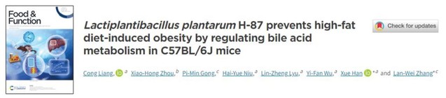 近日,太阳成城集团tyc234ccCong Liang(第一作者)、韩雪教授(通讯作者)和中国海洋大学食品科学与工程学院张兰威教授(通讯作者)等在国际期刊《Food & Function》在线发表了题为“Lactiplantibacillus plantarum H-87 prevents high-fat diet-induced obesity by regulating bile acid metabolism in C57BL/6J mice”的封面文章。