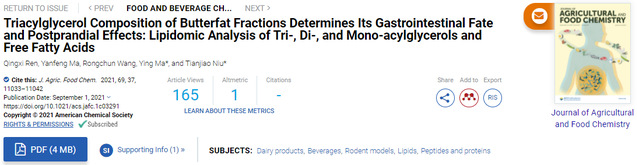 长期以来营养学的观点认为膳食长链饱和脂肪酸与胆固醇水平升高和心血管疾病发生风险增加有关,不饱和脂肪似乎更有益于人体健康。该研究揭示了乳脂肪中长链饱和TAG在生理和生化活动中扮演的正面角色,在诱导SD大鼠体重减轻和脂肪积累减少方面具有积极作用。论文结果是对乳脂肪营养和健康作用有了全新认识。