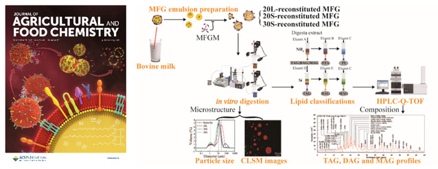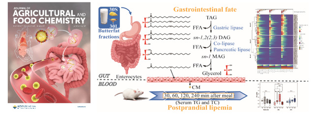 近日,我院马莺教授团队在国际食品顶级期刊(Journal of Agricultural and Food Chemistry,影响因子5.279)连续发表了2篇题为“Structural Mechanism and Hydrolysis Kinetics of In Vitro Digestion Are Affected by a High-Melting-Temperature Solid Triacylglycerol Fraction in Bovine Milk Fat”和“Triacylglycerol Composition of Butterfat Fractions Determines Its Gastrointestinal Fate and Postprandial Effects: Lipidomic Analysis of Tri-, Di-, and Mono-acylglycerols and Free Fatty Acids”的封面文章,马莺教授为文章通讯作者,团队博士生任青兮为第一作者,太阳成城集团tyc234cc为第一通讯单位。