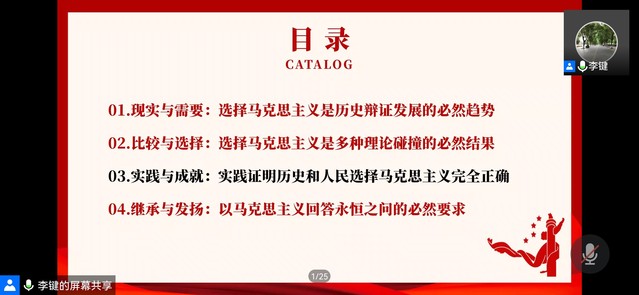 随后,李键为大家讲述《历史和人民选择马克思主义何以必然》主题党课,李老师从现实与需要“选择马克思主义是历史辩证发展的必然趋势”;比较与选择“选择马克思主义是多重理论碰撞的必然结果”;实践与成就“实践证明历史和人民选择马克思主义完全正确”;继承与发扬“以马克思主义回答永恒之问的必然要求”四大部分深入浅出、发人深省地为大家讲解了马克思主义成为我们党和人民的选择的必然性。