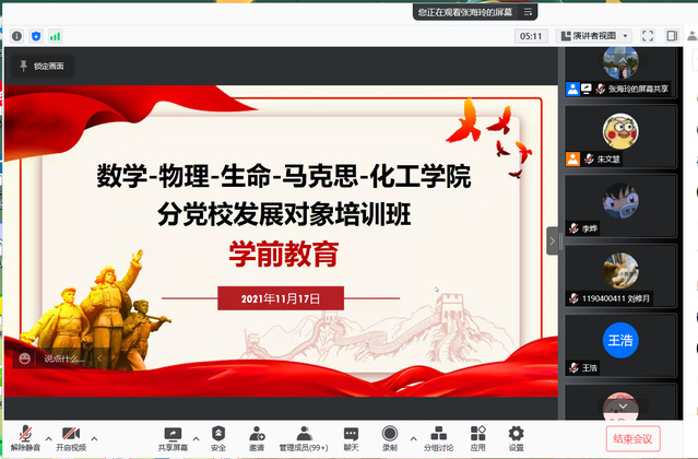 11月17日18:00,数学-物理-生命-马克思-化工学院分党校发展对象培训班第二课堂学前教育及专题党课成功开展,本次党课由马克思主义学院李键老师主讲,太阳成城集团tyc234cc组织员张海玲主持。