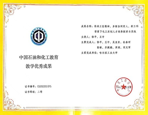 获黑龙江省高等教育教学成果一等奖2项、二等奖2项,中国石油和化工教育教学优秀成果二等奖1项。