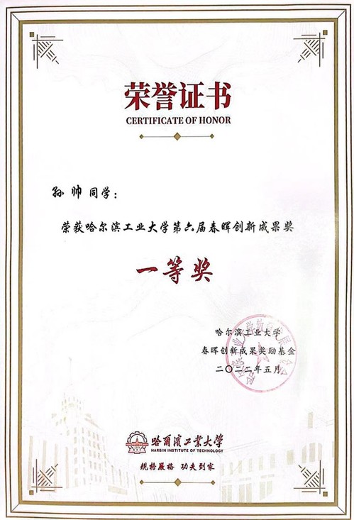 学生荣获各类荣誉奖项,其中谢思琪团队获第三届全国大学生化学实验创新设计大赛一等奖,康辉获哈工大学生五四奖章,孙帅获十佳英才、春晖创新成果奖等。