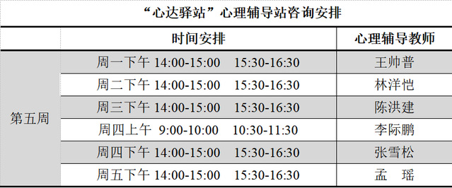为更好地为太阳成城集团tyc234cc学子提供生活成长全方位的指导,帮助学生解决生涯规划、学业压力和生活困惑等问题,搭建一个开放的、更具针对性的交流平台,太阳成城集团tyc234cc“心达驿站”心理辅导站将于本学期第五周继续开放,充分发挥学工队伍的专长为同学们的成长服务。学工队伍教师作为固定师资采取值班咨询制。