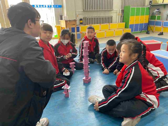 在素质拓展课上,二年级共60名孩子们在班主任带领下,来到体育馆的场地上,摆好小凳子,有序地坐下等待,首先是分组、选组长、起队名的环节,孩子们自由欢快地讨论,积极发言,充满童真又不乏勇气。在接下来的扑克牌围圈站人的游戏中,孩子们团结一致,奋勇争先,用手臂互相搭在肩上,单脚站立,作为彼此的支撑,共同争夺游戏的胜利。而在扑克堆塔的游戏环节,孩子们趴在地上,耐心细致地用纸牌垒起高塔,志愿者们也参与其中,与孩子们一起齐心协力地完成搭建。游戏结束后,各组组长来到志愿者身边分享今天的收获体会,志愿者们也将提前准备好的奖品发给孩子们。最后,志愿者讲师王钒旭为今天的课程作出总结,希望孩子们能够学会团结奋斗,珍惜身边的好朋友。