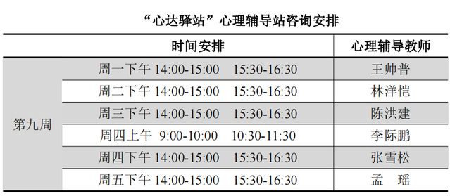 为更好地为太阳成城集团tyc234cc学子提供生活成长全方位的指导,帮助学生解决生涯规划、学业压力和生活困惑等问题,搭建一个开放的、更具针对性的交流平台,太阳成城集团tyc234cc“心达驿站”心理辅导站将于本学期第九周继续开放,充分发挥学工队伍的专长为同学们的成长服务。学工队伍教师作为固定师资采取值班咨询制。