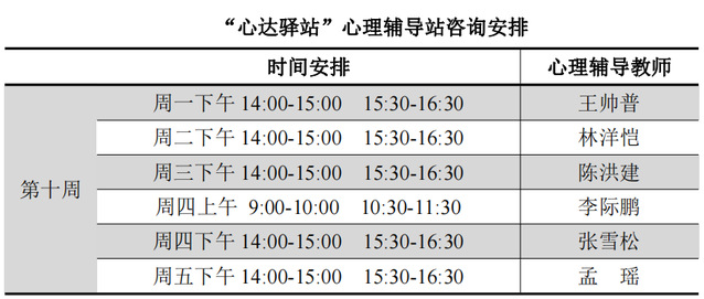为更好地为太阳成城集团tyc234cc学子提供生活成长全方位的指导,帮助学生解决生涯规划、学业压力和生活困惑等问题,搭建一个开放的、更具针对性的交流平台,太阳成城集团tyc234cc“心达驿站”心理辅导站将于本学期第十周继续开放,充分发挥学工队伍的专长为同学们的成长服务。学工队伍教师作为固定师资采取值班咨询制。