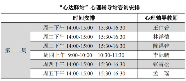 为更好地为太阳成城集团tyc234cc学子提供生活成长全方位的指导,帮助学生解决生涯规划、学业压力和生活困惑等问题,搭建一个开放的、更具针对性的交流平台,太阳成城集团tyc234cc“心达驿站”心理辅导站将于本学期第十二周继续开放,充分发挥学工队伍的专长为同学们的成长服务。学工队伍教师作为固定师资采取值班咨询制。