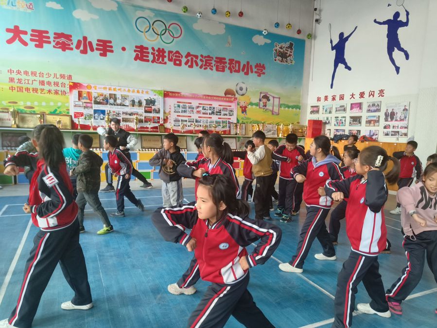 本次趣味化学实验课,由志愿者讲师徐康俊带领孩子们走进化学的世界。首先从生活中的化学入手,激发孩子们的学习兴趣,随后带着孩子们一起动手开展“隐形墨水”和“流血的心”两个实验。在观察到明显的颜色变化后,孩子们一个个都激动不已,赞叹化学的神奇之处。武术课中,同学们跟着志愿者讲师王浩宇学习“哈工大拳”的基本动作,立正、抱拳、出拳、收掌、伸掌、踢腿……每一个动作都学的非常认真。在讲师和助教的耐心指导下,同学们的动作也从最初的不协调变得逐渐标准起来。课程即将结束时,志愿者们预留一点时间让同学们提出问题并为其解答疑惑,一起分享交流课堂体验,最后为孩子们分发提前准备的小礼物。