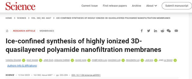 近日,我院教授、城市水资源与水环境国家重点实验室成员邵路团队受冰/水相变过程启发,采用“冰限域”界面聚合(IC-IP)技术成功制备出高度离子化聚酰胺纳滤膜。相关研究以《冰限域合成高度离子化三维准层状聚酰胺纳滤膜》(Ice-confined synthesis of highly ionized 3D-quasilayered polyamide nanofiltration membranes)为题发表在《科学》(Science)上。