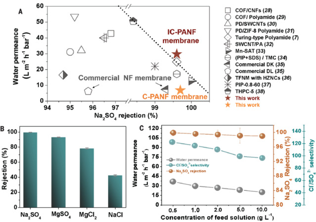 与在常规水/正己烷界面形成的具有致密非均相结构的传统商用聚酰胺纳滤膜相比,“冰限域”界面聚合合成的纳滤膜具有独特的高度离子化三维准层状褶皱结构,该独特结构赋予新型纳滤膜优异的盐分离效果和一/二价阴离子筛分性能,可高效过滤纳米/亚纳米级小分子和离子物质。