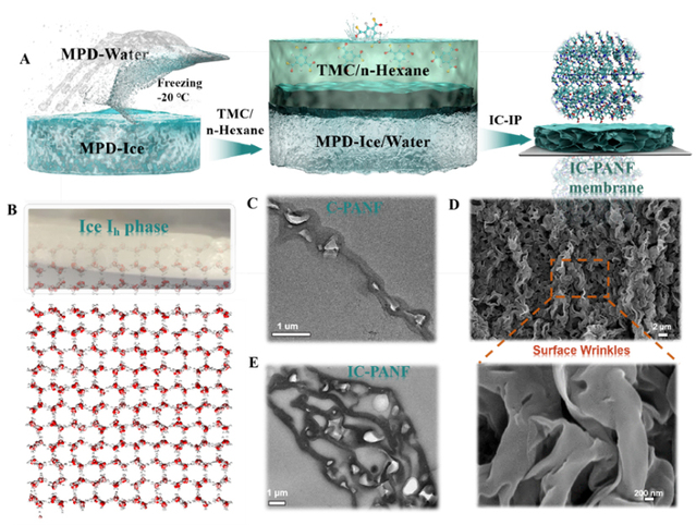长期在冰雪环境工作生活的团队将目光转移到冰化学方向。经过6年的不懈研究,团队发现冰/水相变过程可有效控制单体在受限界面“冰”相中的扩散,从而调控界面处单体反应,单体可通过先前形成的大孔层状结构的间隙/孔道进一步反应,形成具有独特物化结构特点的选择层。通过实验和理论研究,团队证实了“冰限域”在纳滤膜界面聚合过程中,对聚酰胺功能层结构形成的特殊作用,并通过实验测定了合成纳滤膜的三维准层状褶皱结构及其离子化程度。