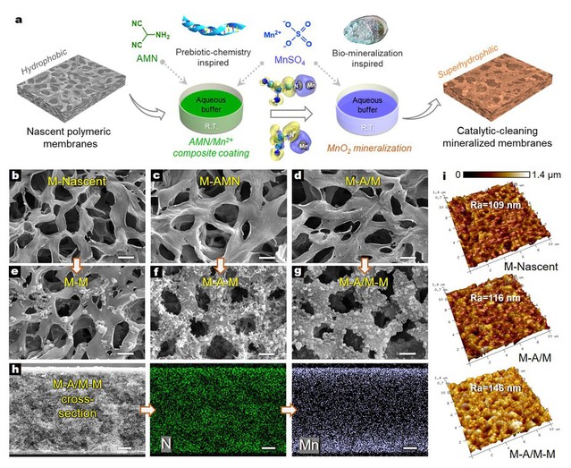 近日,哈工大城市水资源与水环境国家重点实验室成员、我院邵路教授团队提出前生命化学衍生的仿生矿化表面改性新方法,构筑原位催化清洁膜。该合成制备过程温和、普适、无污染,可在室温水溶液体系中进行,在开发新型功能材料领域具有广阔应用前景。相关论文以《前生命化学启发矿化制备原位催化清洁膜》(Engineering in-situ catalytic cleaning membrane viaprebiotic-chemistry-inspired mineralization)为题发表在《先进材料》(Advanced Materials)上。