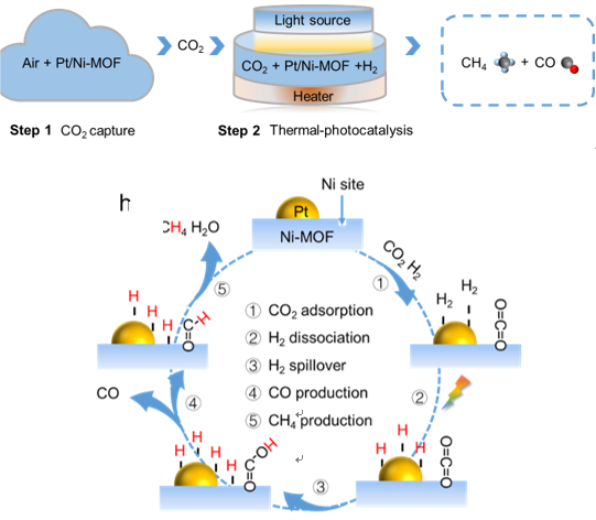受光合作用启发,在前期光-热协同催化还原CO2研究(曾发表于《自然通讯》和《德国应用化学》)基础上,李英宣课题组开发了多功能-铂负载镍基金属有机框架-光催化剂,不仅可选择性地从空气中捕获超低浓度的CO2 (吸附量达到0.987毫摩尔每克),而且还可将富集的CO2原位转化为高附加值的CO和CH4,在940纳米波长处的量子效率达到创纪录的9.57%,突破了红外光难以高效利用的局限。同时,该研究还深入探讨反应过程中光-热协同、铂-镍双位点协同作用的微观机制,为热辅助光催化还原CO2提供新思路。