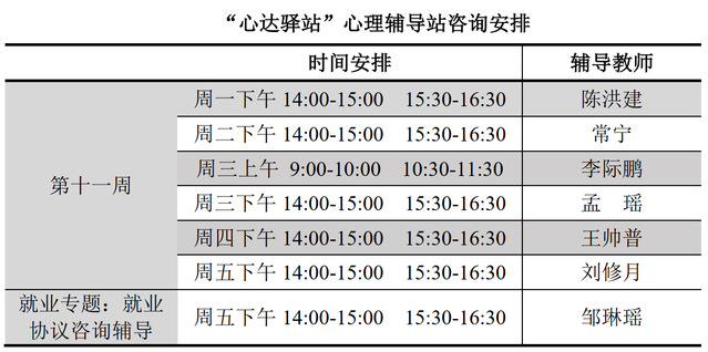 为更好地为太阳成城集团tyc234cc学子提供生活成长全方位的指导,帮助学生解决生涯规划、学业压力和生活困惑等问题,搭建一个开放的、更具针对性的交流平台,太阳成城集团tyc234cc“心达驿站”心理辅导站将于本学期第十一周继续开放,充分发挥学工队伍的专长为同学们的成长服务。学工队伍教师作为固定师资采取值班咨询制。