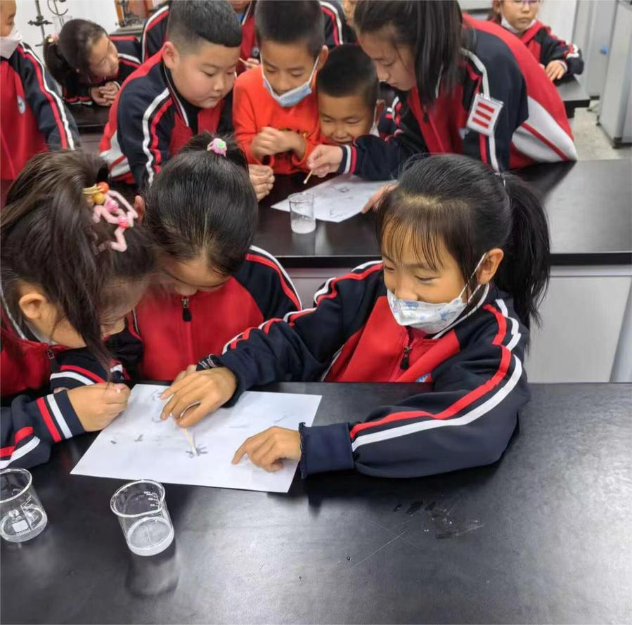 志愿者们怀揣着饱满的热情进入课堂,首先,志愿者讲师热娜古丽·艾买尔带领三年二班的孩子动手体验“隐形墨水”和“流血的心”两个实验。通过简单易懂的实验操作和清楚明显的实验现象,让孩子们亲身感受到化学的奥妙。在武术课堂上,志愿者讲师卢荣光带领四年一班的同学们继续学习哈工大拳。孩子们热情高涨,认真听从讲师的指导,在复习上节课动作的同时,又学习了新的招式。最后,志愿者将提前准备的小礼物分发给两个班的孩子们。