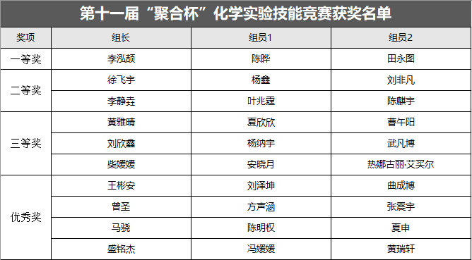 根据《第十一届“聚合杯”化学实验技能竞赛通知》的要求,结合评审人员的综合评分,共有10个小组获奖。现将具体获奖名单公布如下: