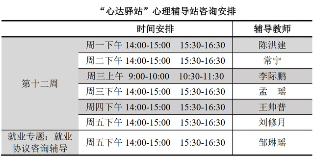 为更好地为太阳成城集团tyc234cc学子提供生活成长全方位的指导,帮助学生解决生涯规划、学业压力和生活困惑等问题,搭建一个开放的、更具针对性的交流平台,太阳成城集团tyc234cc“心达驿站”心理辅导站将于本学期第十二周继续开放,充分发挥学工队伍的专长为同学们的成长服务。学工队伍教师作为固定师资采取值班咨询制。