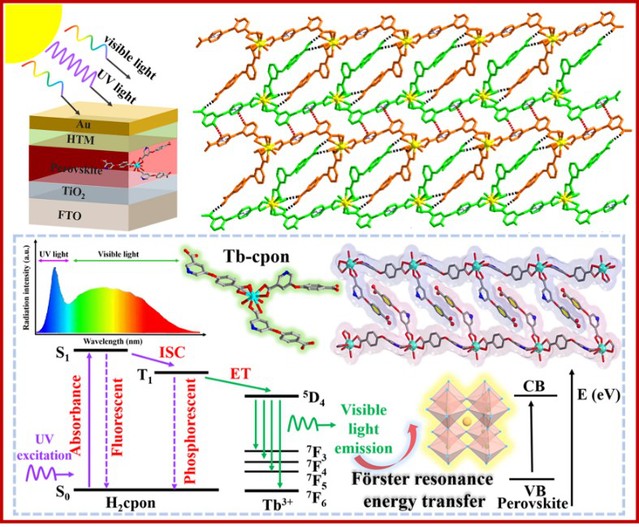 基于此,团队通过设计镧系超分子框架材料调控钙钛矿晶体层的生长过程,并借助镧系金属发光中心和配体生色团之间的有效耦合和电荷跃迁以及与钙钛矿吸光层内的佛斯特(Forster)共振能量转移,增强复合钙钛矿薄膜的光谱响应范围。结果表明,优化后的电池器件性能明显提升,未封装的器件在紫外光(310纳米)连续从金电极一侧照射24小时后仍保持了80%以上的初始效率。更为重要的是,优化后的PSCs器件具有灵敏的紫外光响应,在纯紫外光下的转换电流密度是空白器件的6.5倍以上。此外,得益于更宽的光谱响应范围和更高质量的钙钛矿薄膜,优化后的PSCs表现出高达23.72%的输出效率。该研究工作展示出构建紫外光下转换材料是提高钙钛矿光伏器件紫外光稳定性和全光谱利用率的有效方法,有助于拓展钙钛矿光伏在高紫外光刺激下的应用场景。