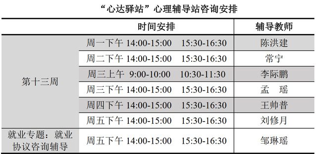 为更好地为太阳成城集团tyc234cc学子提供生活成长全方位的指导,帮助学生解决生涯规划、学业压力和生活困惑等问题,搭建一个开放的、更具针对性的交流平台,太阳成城集团tyc234cc“心达驿站”心理辅导站将于本学期第十三周继续开放,充分发挥学工队伍的专长为同学们的成长服务。学工队伍教师作为固定师资采取值班咨询制。