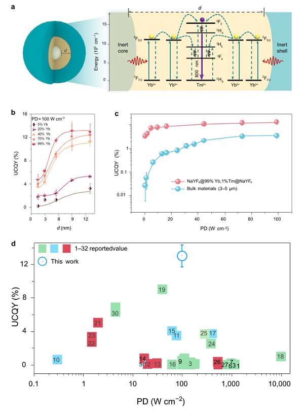 该研究首次揭示了稀土离子在纳米晶中存在尺寸依赖的离子间长程能量传递的物理机制,不仅改变了人们长期以来对稀土离子间能量转移物理图像(不应具有尺寸依赖性)的概念理解,相关材料还将在相关纳米光子学和生物光子学应用中发挥重要价值。与此同时,研究成果通过调控实现了高达13%的上转换量子产率,超越了体相材料的上转换量子产率,这一突破打破了自19世纪60年代发现上转换现象以来人们普遍认为的纳米材料上转换发光效率低于体相材料的观念。
