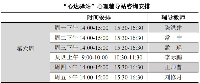 为更好地为太阳成城集团tyc234cc学子提供生活成长全方位的指导,帮助学生解决生涯规划、学业压力和生活困惑等问题,搭建一个开放的、更具针对性的交流平台,太阳成城集团tyc234cc“心达驿站”心理辅导站将于本学期第六周继续开放,充分发挥学工队伍的专长为同学们的成长服务。学工队伍教师作为固定师资采取值班咨询制。
