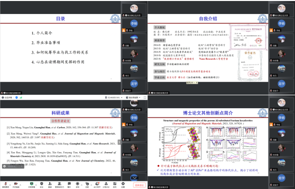 搭建交流平台,发挥人才优势,推动党建科研双融合、双促进、双提升。4月12日,李月、李尚松、乔欣、赵伟、张楠5名博士生围绕“功能材料制备及性能研究”(总第223期),从不同的角度分享该领域的研究进展和自己的科研成果。个人分享结束后,同学们就自己科研中的重点难点积极沟通,主动分享。碰撞才能产生火花,交流才能汇聚智慧,互鉴才能促进发展。