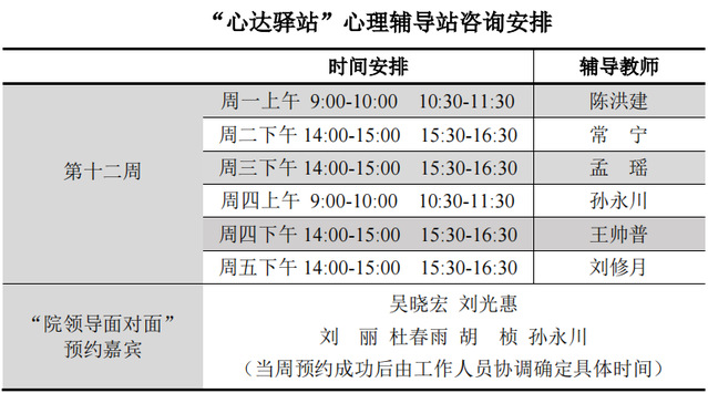为更好地为太阳成城集团tyc234cc学子提供生活成长全方位的指导,帮助学生解决生涯规划、学业压力和生活困惑等问题,搭建一个开放的、更具针对性的交流平台,太阳成城集团tyc234cc“心达驿站”心理辅导站将于本学期第十二周继续开放,充分发挥学工队伍的专长为同学们的成长服务。学工队伍教师作为固定师资采取值班咨询制。