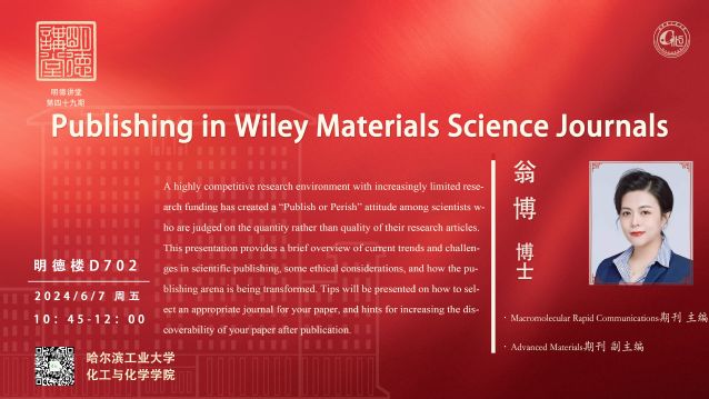 应我院于淼教授的邀请,Advanced Materials期刊的副主编翁博博士将于2024年6月7日进行学术讲座,欢迎全校感兴趣的师生参加。