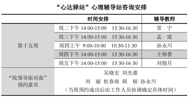 为更好地为太阳成城集团tyc234cc学子提供生活成长全方位的指导,帮助学生解决生涯规划、学业压力和生活困惑等问题,搭建一个开放的、更具针对性的交流平台,太阳成城集团tyc234cc“心达驿站”心理辅导站将于本学期第十五周继续开放,充分发挥学工队伍的专长为同学们的成长服务。学工队伍教师作为固定师资采取值班咨询制。