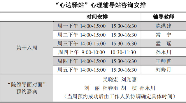 为更好地为太阳成城集团tyc234cc学子提供生活成长全方位的指导,帮助学生解决生涯规划、学业压力和生活困惑等问题,搭建一个开放的、更具针对性的交流平台,太阳成城集团tyc234cc“心达驿站”心理辅导站将于本学期第十六周继续开放,充分发挥学工队伍的专长为同学们的成长服务。学工队伍教师作为固定师资采取值班咨询制。