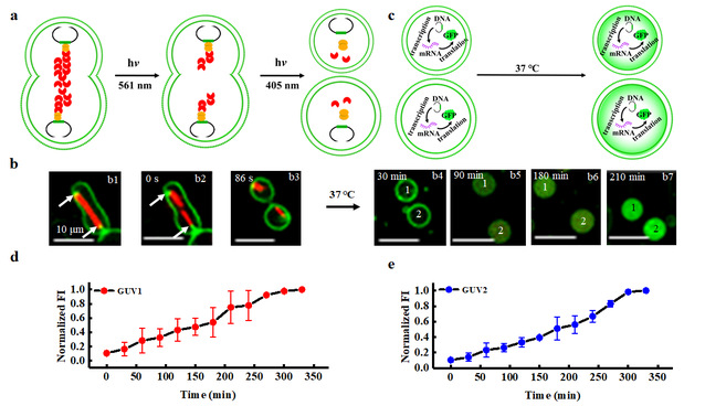 基于上述挑战,韩晓军教授团队模拟了细菌子代遗传过程,将人造细胞分裂、细菌质粒分离系统和无细胞蛋白质合成系统耦合,实现了子代细胞内的基因分配和蛋白质表达,模拟了细菌子代遗传过程。ParMRC系统作为细菌DNA分离最具代表性的系统之一,经纯化重组到人造细胞中。在ParR蛋白的帮助下,ParM蛋白丝将parC DNA分离到人造细胞两极。渗透压导致包含ParMRC系统和无细胞蛋白质合成系统的人造细胞发生形变,分裂后DNA主动分配到子细胞中,运用无细胞蛋白质合成技术在子代细胞中成功表达了绿色荧光蛋白,模拟了细菌的子代遗传。该成果为构建具有DNA主动分离能力且具有遗传功能的人造细胞奠定基础。