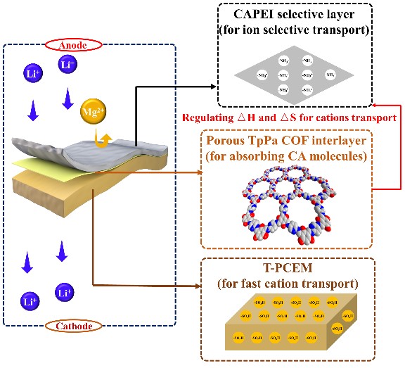 针对此难题,邵路教授团队提出在基材与荷正电选择层间引入多孔中间层吸附功能性小分子交联剂(咖啡酸分子)以提升基材与选择层间的结合性,提高荷正电选择层交联度并增加膜表面功能基团含量,实现对离子跨膜传输的熵垒和焓垒同步调控,维持锂离子跨膜传质阻力,同时有效提升高价离子跨膜传质阻力,最终所得膜展现出极为优异的锂/镁分离性能。该工作为我国高镁锂比盐湖锂资源高效提取提供新路径,为保障我国能源安全等重大战略提供先进的分离膜技术支撑。