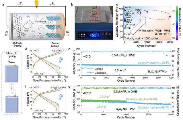基于此,团队发现二维层状材料Ti3C2 MXene在相对室温(25℃)的低温环境下表现出更优异的倍率性能与循环稳定性,并将其作为负极与聚三苯胺正极组装成钾双离子全电池。研究表明,低温下电解液中钾离子与溶剂之间的相互作用增强,导致Ti3C2表面形成以有机物为主的固体电解质界面,促使Ti3C2回避了低温下具有高反应活化能垒的脱溶剂过程,加速了Ti3C2在该体系下的动力学行为。电化学测试结果表明,该钾双离子全电池在-60℃ 0.5 A/g循环20000次后的容量保持率为86.7%。该项工作克服了超低温环境下双离子电池性能衰减难题,为实现其实际应用开辟新途径。