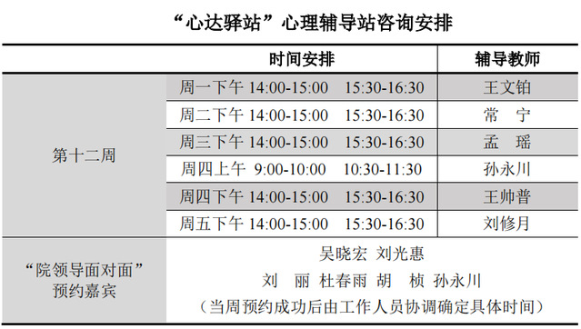 为更好地为太阳成城集团tyc234cc学子提供生活成长全方位的指导,帮助学生解决生涯规划、学业压力和生活困惑等问题,搭建一个开放的、更具针对性的交流平台,太阳成城集团tyc234cc“心达驿站”心理辅导站将于本学期第十二周继续开放,充分发挥学工队伍的专长为同学们的成长服务。学工队伍教师作为固定师资采取值班咨询制。