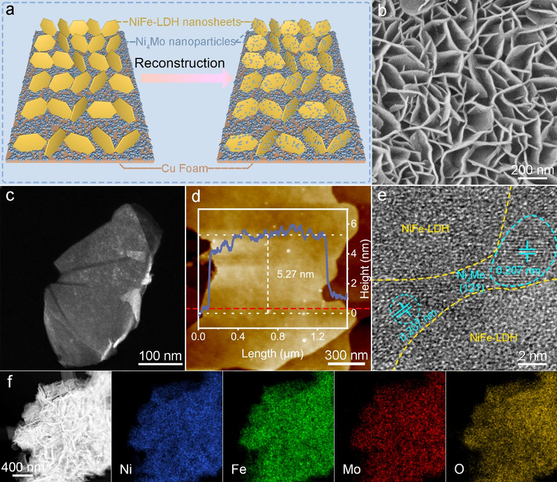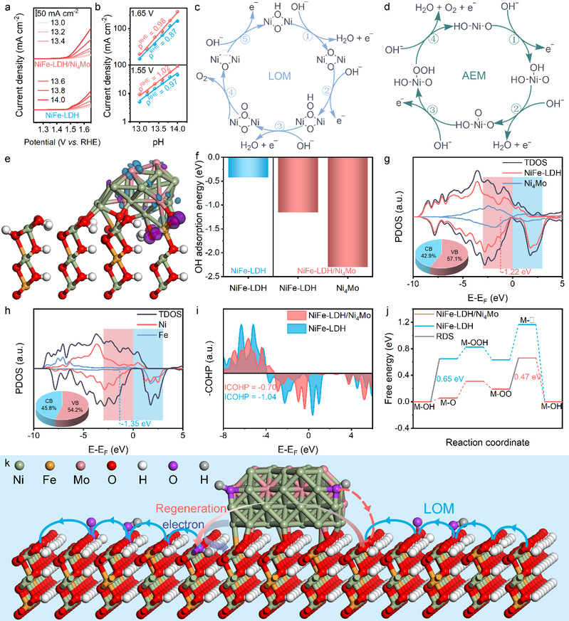 基于此,团队提出氧泵策略,通过在镍铁层状双氢氧化物纳米片上负载亲氧镍钼合金纳米颗粒(镍铁层状双氢氧化物/镍钼合金)以提高催化剂的活性和稳定性。研究结果表明,镍钼合金向镍铁层状双氢氧化物提供电子,使得镍铁层状双氢氧化物的金属-氧键和氧-氢键共价性减弱,在析氧反应中更容易形成氧空位,增强反应活性。同时,镍钼合金对电解液中氢氧根具有较强的吸附作用,并为镍铁层状双氢氧化物提供含氧物质,使氧空位得到及时补充,进而增强催化剂的稳定性。该设计方案有望实现晶格氧机制析氧反应催化剂活性和稳定性的共同提升。