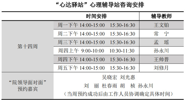 为更好地为太阳成城集团tyc234cc学子提供生活成长全方位的指导,帮助学生解决生涯规划、学业压力和生活困惑等问题,搭建一个开放的、更具针对性的交流平台,太阳成城集团tyc234cc“心达驿站”心理辅导站将于本学期第十四周继续开放,充分发挥学工队伍的专长为同学们的成长服务。学工队伍教师作为固定师资采取值班咨询制。