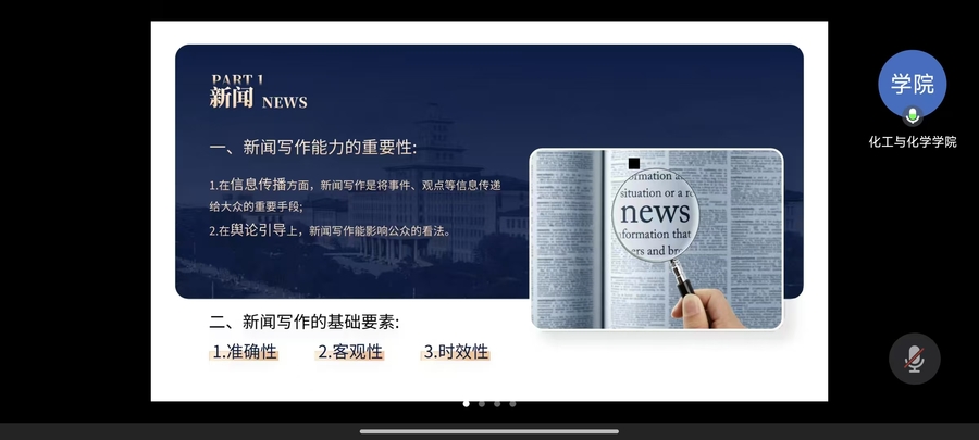会上,侯佳佳围绕提升新闻写作能力的重要性、新闻写作结构与技巧、摄影及图像的选择三个方面开展了培训,并以具体案例进行生动阐述,鼓励宣传委员积极发挥宣传作用、切实提升工作实效。她强调了新闻的时效性、行文的规范性及宣传工作的重要性,并对各类项目申报、学术交流、参观走访、被采访等过程进行了详细的讲解。