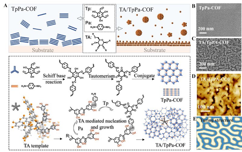 邵路教授团队提出运用单宁酸作为异质成核位点,通过调控反应-扩散动力学,在均相溶液中原位合成具有图灵结构的共价有机骨架膜。单宁酸通过西夫碱反应生成定义的反应前驱体,增加反应速率并减小扩散速率,在满足图灵结构设计条件的同时,通过空间位阻和电荷排斥,将共价有机骨架膜晶体转变为均匀分散的球体,最终形成孔径均匀的薄膜。团队制备出的共价有机骨架膜成功实现了超快速、低能耗的有机溶剂纳滤。