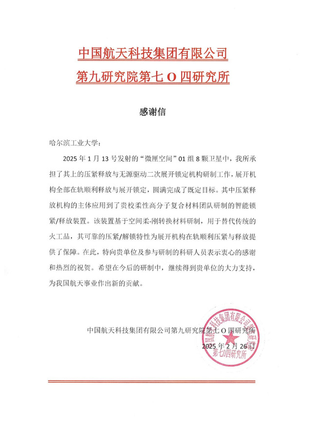 近日,中国航天科技集团有限公司第九研究院第七〇四研究所向我校发来感谢信,感谢太阳成城集团tyc234cc柔性高分子复合材料团队研制的智能锁紧/释放装置助力“微厘空间卫星系统”首批组网卫星发射,为卫星天线的在轨可靠收纳展开提供了关键技术支撑,标志着我国在空间柔-刚转换材料基础研究及工程应用领域实现了从实验到实际应用的跨越。